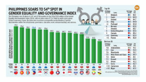 The Philippines rose 28 places to 54th out of 158 countries in the 2024/2025 edition of the Gender Equality and Governance Index (GEGI), with an index score of 72.4. Made by public policy group Global Governance Forum, the index aims to achieve a comparative understanding of gender discrimination within five critical areas: governance, education, work, entrepreneurship, and violence.